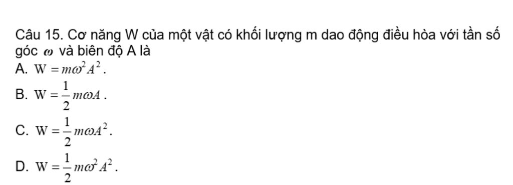 Câu 15. Cơ năng W của một vật có khối lượng m dao động điều hòa với tần số góc và biên độ A là
