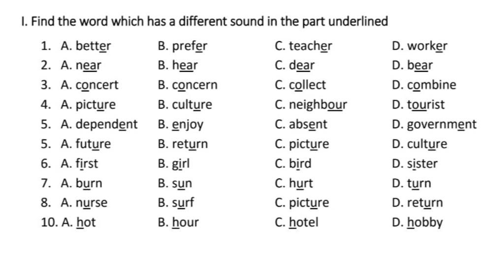 `1,B` ( âm /ɜː/ còn lại âm /ə/)