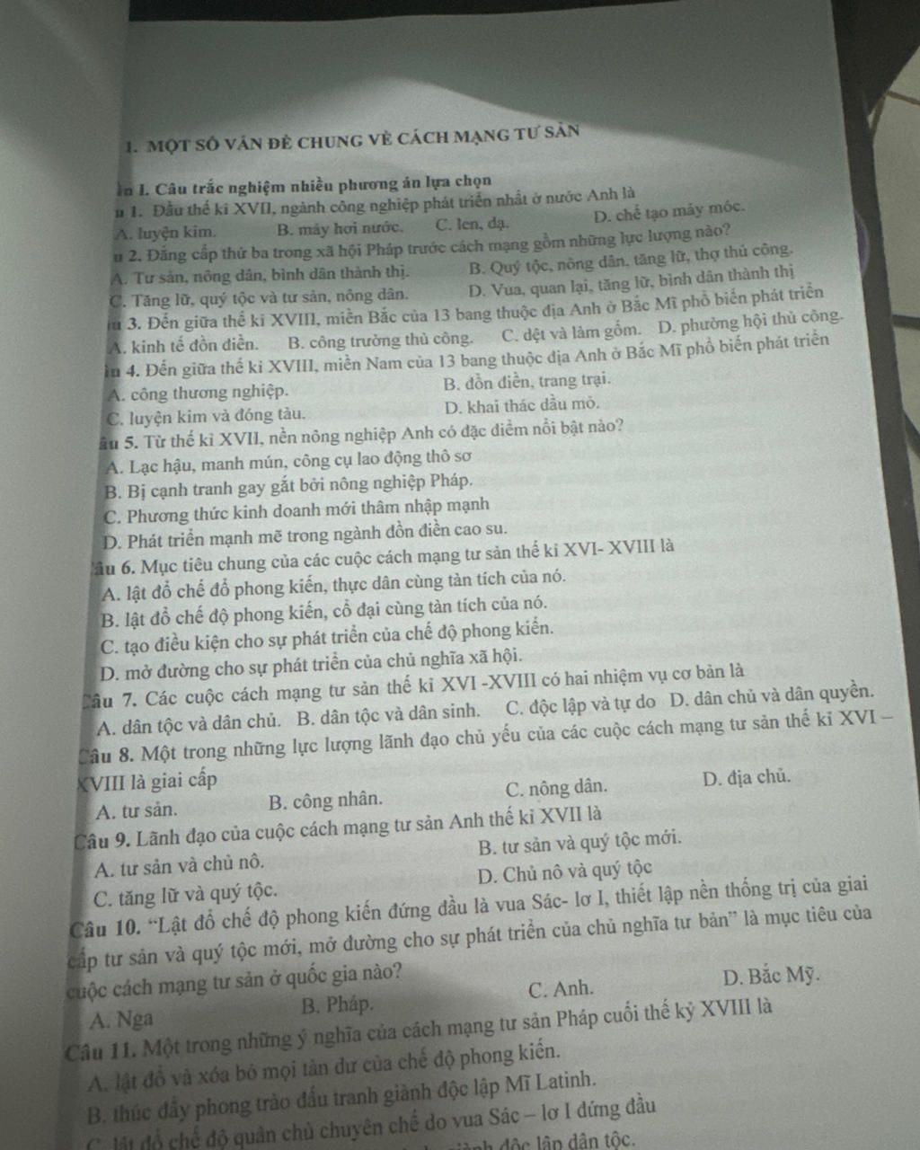 I. MỘT SỐ VẤN ĐỀ CHUNG VỀ CÁCH MẠNG TƯ SẢN