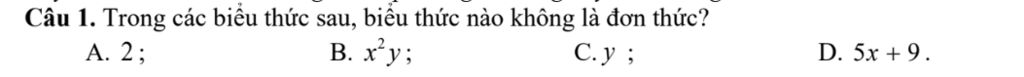 Câu 1. Trong các biểu thức sau, biểu thức nào không là đơn thức?
