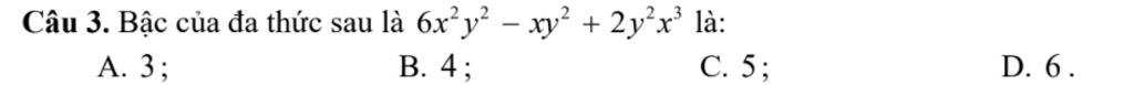 Câu 3. Bậc của đa thức sau là 6x²y² – xy² + 2y²x³ là:
