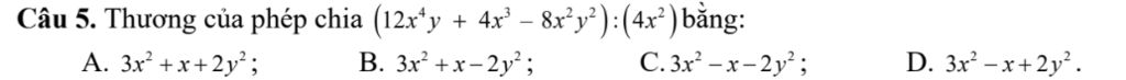 Câu 5. Thương của phép chia `(12x^4y + 4x³ – 8x²y²)`:` (4x²)` bằng: