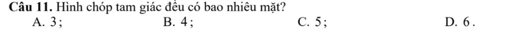 Câu 11. Hình chóp tam giác đều có bao nhiêu mặt?