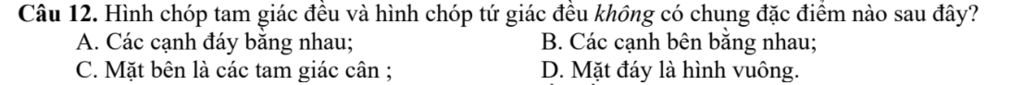 Câu 12. Hình chóp tam giác đều và hình chóp tứ giác đều không có chung đặc điểm nào sau đây?