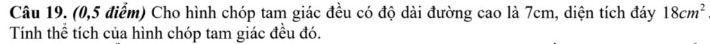 Câu 19. (0,5 điểm) Cho hình chóp tam giác đều có độ dài đường cao là 7cm, diện tích đáy 18cm².
