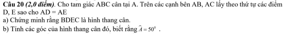 Câu 20 (2,0 điểm). Cho tam giác ABC cân tại A. Trên các cạnh bên AB, AC lấy theo thứ tự các điểm