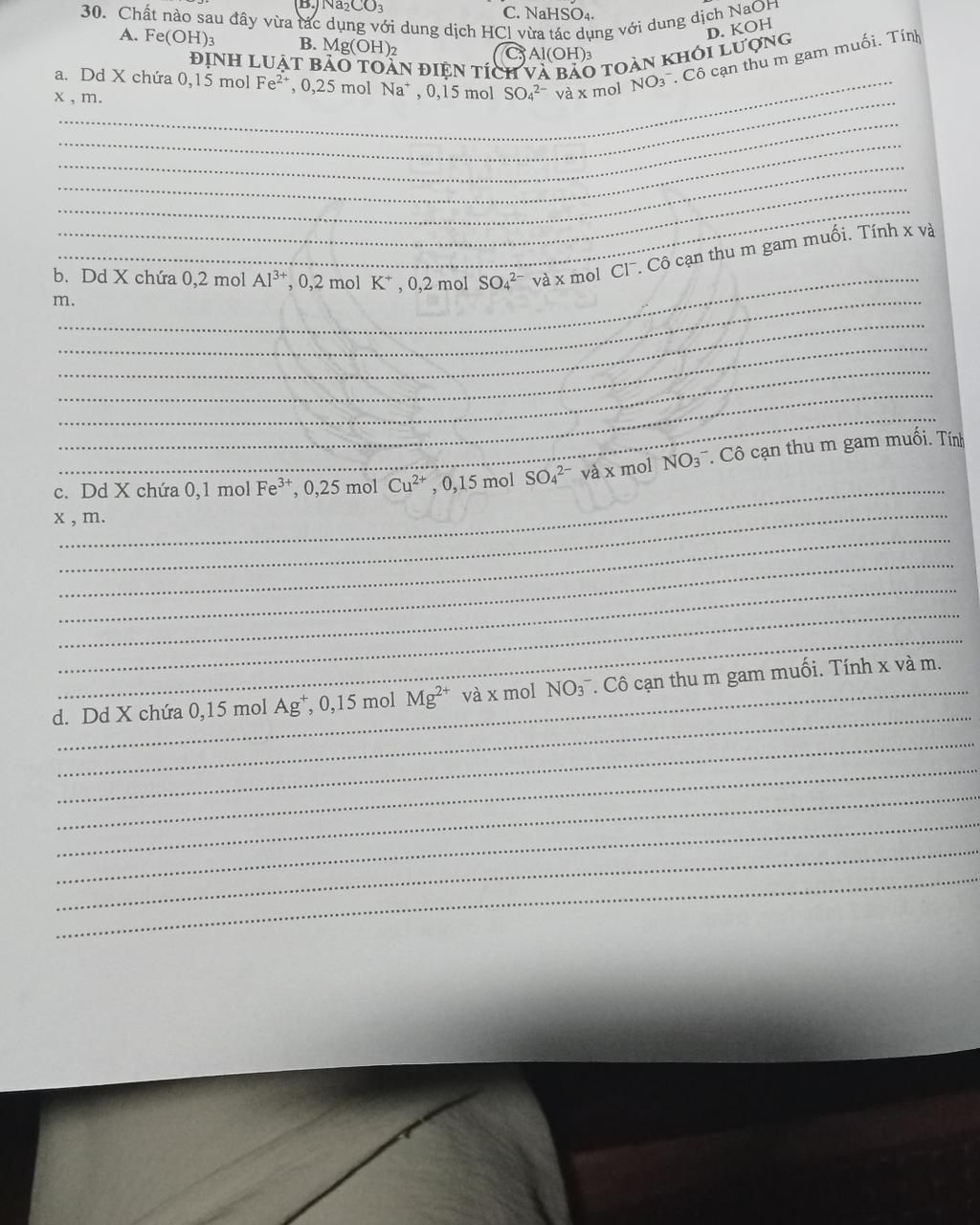 a. Dd X chứa 0,15 mol Fe”, 0,25 mol Na, 0,15 mol SO4 và x mol NO3 . Cô cạn thu m gam muối. Tính