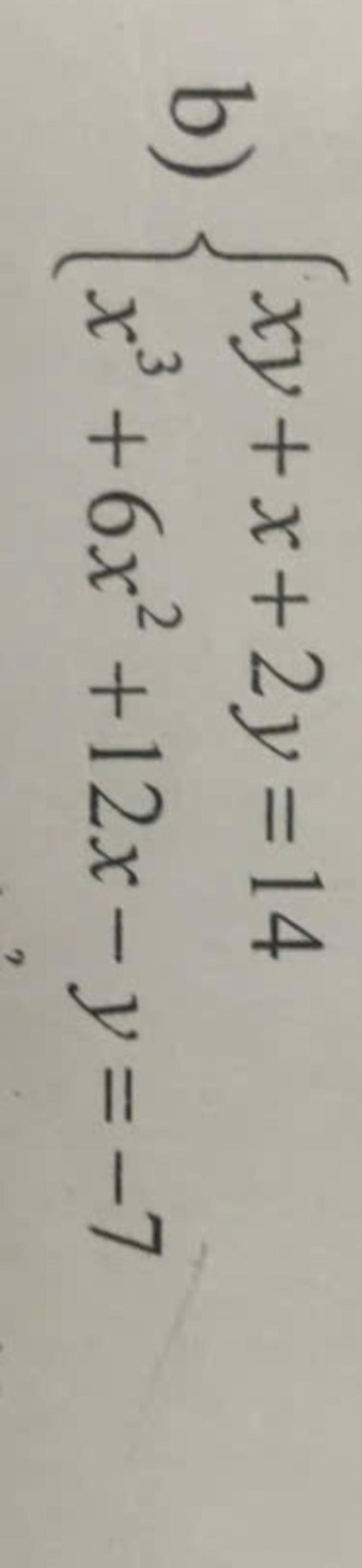`{(xy + x + 2y = 14 ( 1 )),(x^3 + 6x^2 + 12x - y = -7 ( 2 )):}`