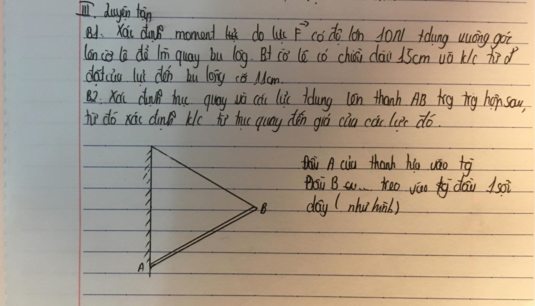 B2. Xác định trục quay và các lực dụng lên thanh AB trợ trg hợp sau,