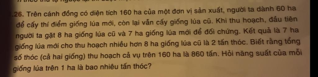 $\to$Năng suất giôngs lúa mới là $6$ tấn/ha, giống lúa cũ là $5$ tấn/ha