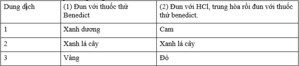 Người ta tiến hành thí nghiệm nhận biết đường khử với các dung dịch chứa các phân tử sinh hoc và thu được kết quả trong bảng dưới: