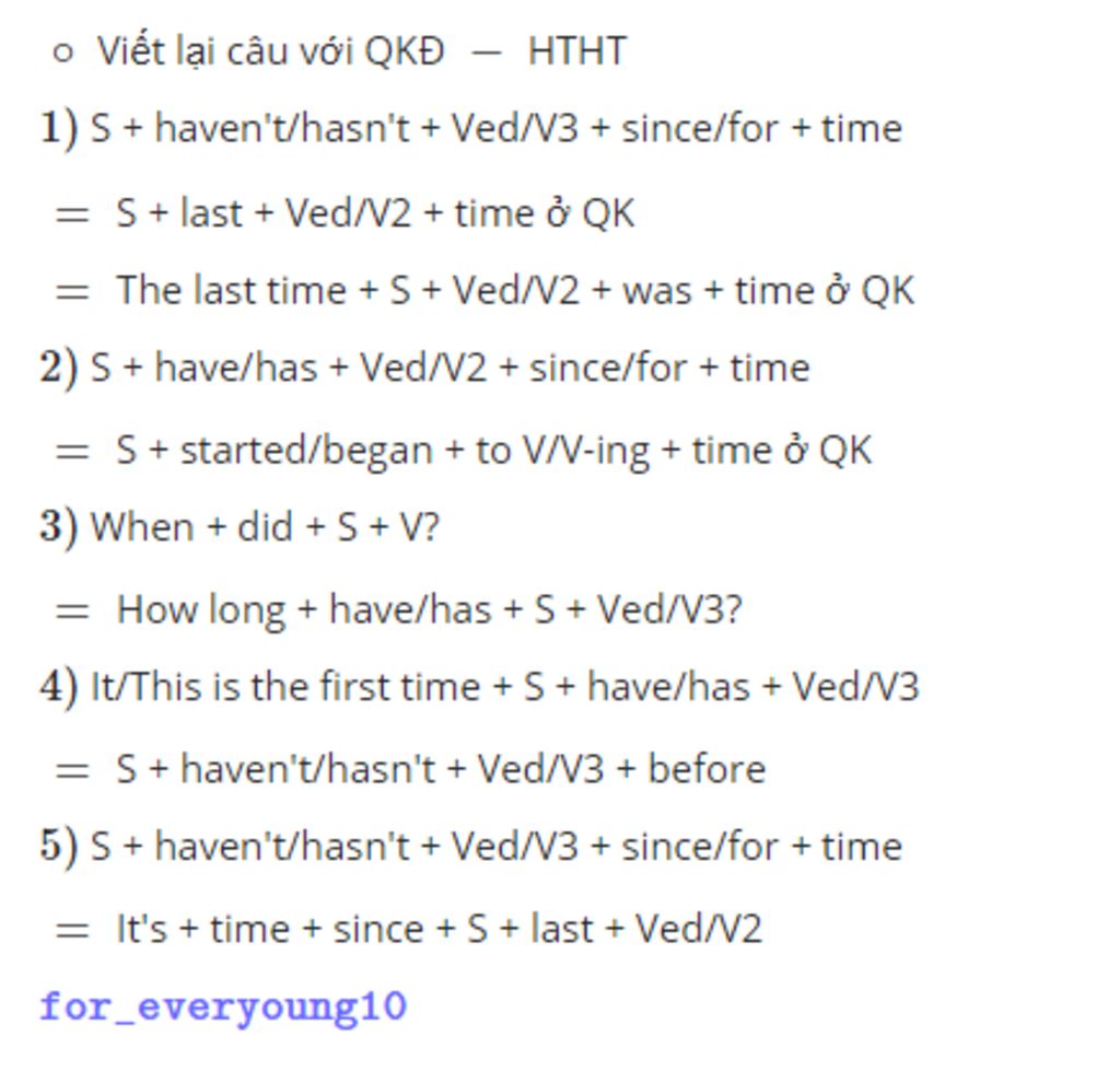 It + is/ has been + khoảng thời gian + since + S + last + Ved/V2 (Đã bao lâu kể từ lần cuối ai làm gì)