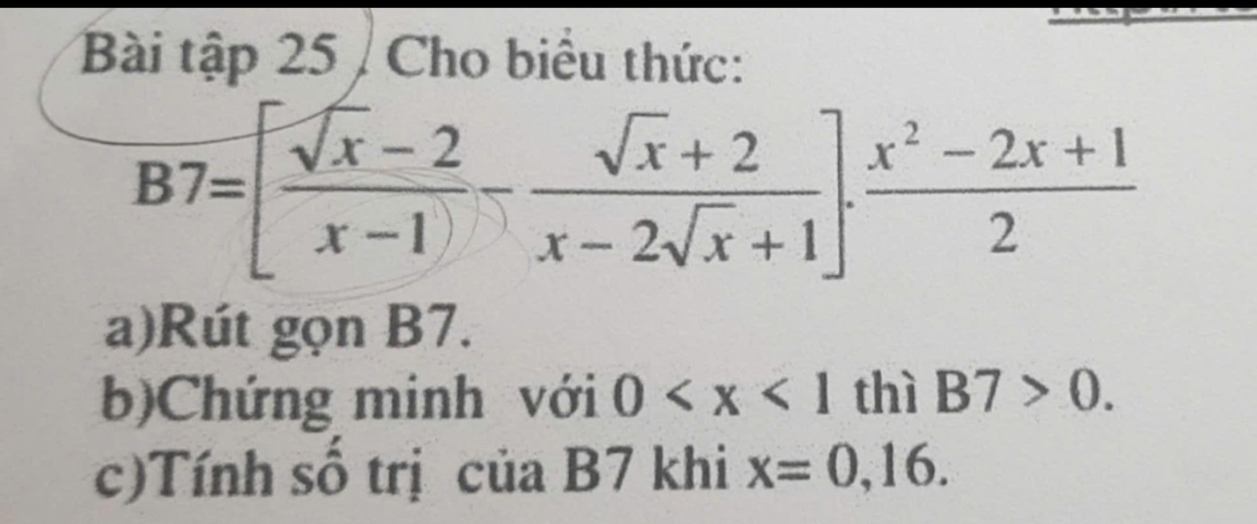 $\to B7=\dfrac{(\sqrt{x}-2)(\sqrt{x}-1)-(\sqrt{x}+1)(\sqrt{x}+2)}{(\sqrt{x}+1)(\sqrt{x}-1)^2}\cdot \dfrac{(x-1)^2}2$
