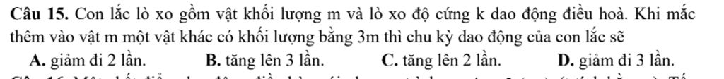 Câu 15. Con lắc lò xo gồm vật khối lượng m và lò xo độ cứng k dao động điều hoà. Khi mắc thêm vào vật m một vật khác có khối lượng bằng 3m thì chu kỳ dao động của con lắc sẽ