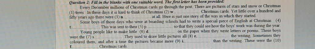 Question 2: Fill in the blanks with one suitable word. The first letter has been provided: