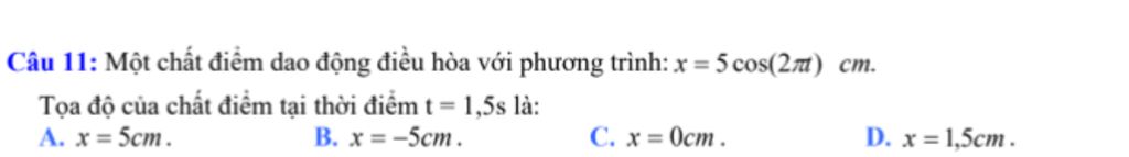Câu 10: Một vật nhỏ dao động điều hòa theo phương trình `x=Acos10t`(t tính bằng s). Tại t=2s, pha của dao động là