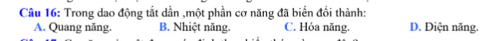 Câu 16: Trong dao động tắt dần ,một phần cơ năng đã biến đổi thành: