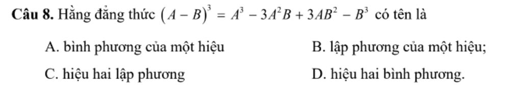 Câu 8. Hằng đẳng thức `( A – B)^3 = A^3– 3A^3B + 3AB^3 – B^3` có tên là