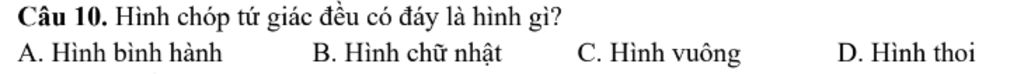Hình chóp tam giác đều có 3 mặt bên là hình tam giác cân , mặt đáy là hình vuông