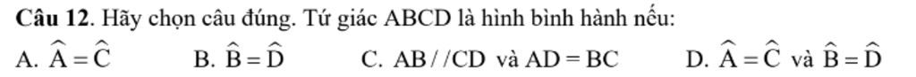 `-` Tứ giác `ABCD` có `\hat{A} = \hat{C}` và `\hat{B} = \hat{D}` thì `ABCD` là hình bình hành