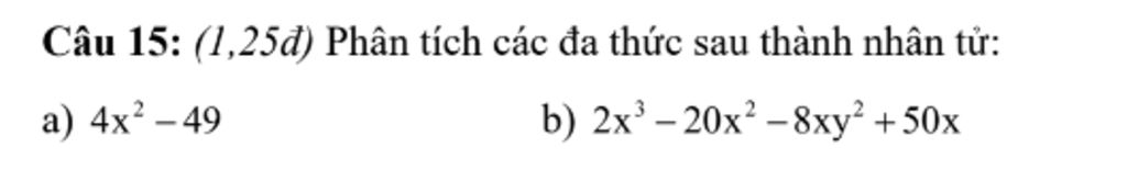 Câu 15: (1,25đ) Phân tích các đa thức sau thành nhân tử: