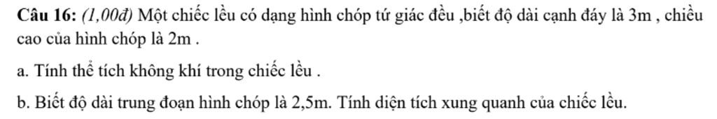 Câu 16: (1,00đ) Một chiếc lều có dạng hình chóp tứ giác đều biết độ dài cạnh đáy là 3m, chiều cao của hình chóp là 2m .