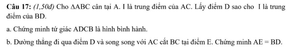 Câu 17: (1,50đ) Cho AABC cân tại A. I là trung điểm của AC. Lấy điểm D sao cho I là trung
