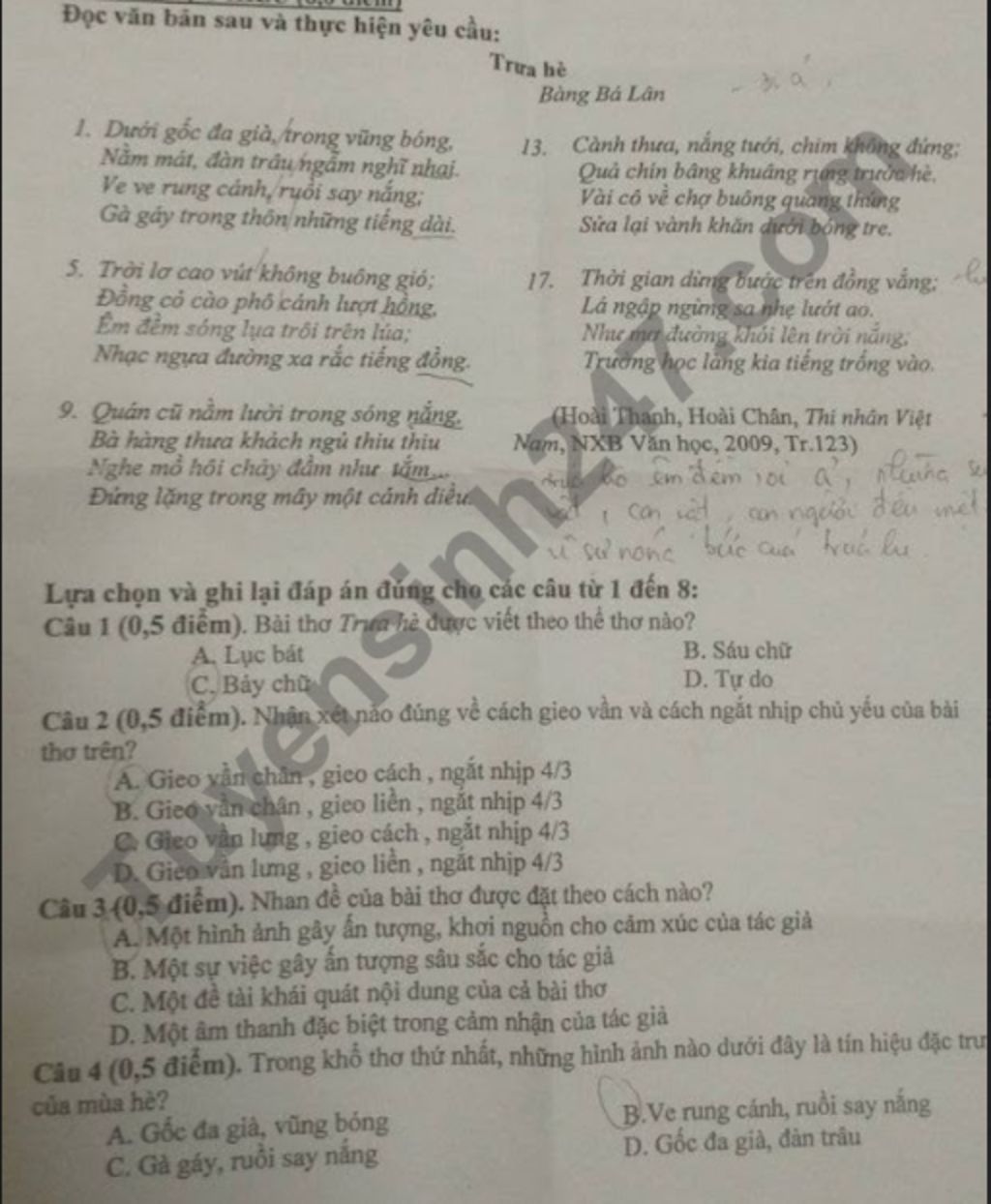 Câu 4 (0,5 điểm). Trong khổ thơ thứ nhất, những hình ảnh nào dưới đây là tín hiệu đặc trụ của mùa hè?