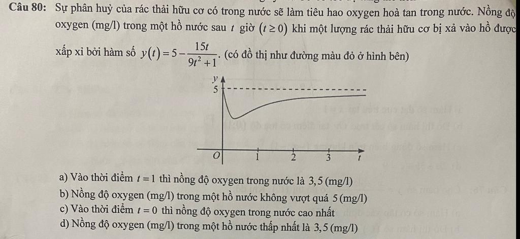Câu 80: Sự phân huỷ của rác thải hữu cơ có trong nước sẽ làm tiêu hao oxygen hoà tan trong nước. Nồng độ