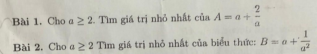 `B=a+1/a^2=a+8/a^2-7/a^2>=2 * sqrt{a * 8/a^2}-7/a^2=4sqrt2-7/a^2>=2sqrt2-7/2^2=2sqrt2-7/4 (Do a>=2)`