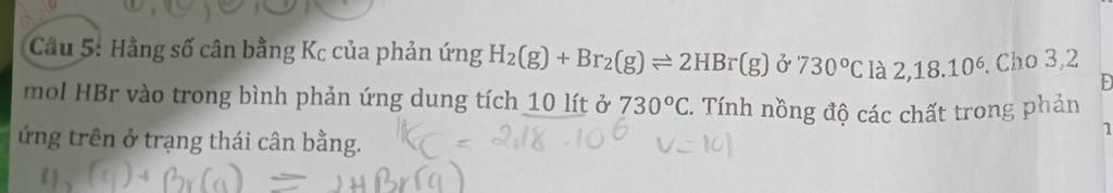 Câu 5: Hằng số cân bằng Kc của phản ứng Hz(g) + Brz(g) = 2HBr(g) ở '730°C là 2,18.106. Cho 3,2