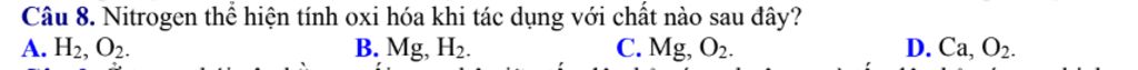 Câu 8. Nitrogen thể hiện tính oxi hóa khi tác dụng với chất nào sau đây?