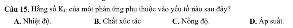 `->` Hằng số $\rm K_c$ phụ thuộc vào nhiệt độ , khi nhiệt độ thay đổi hằng số $\rm K_c$ sẽ thay đổi