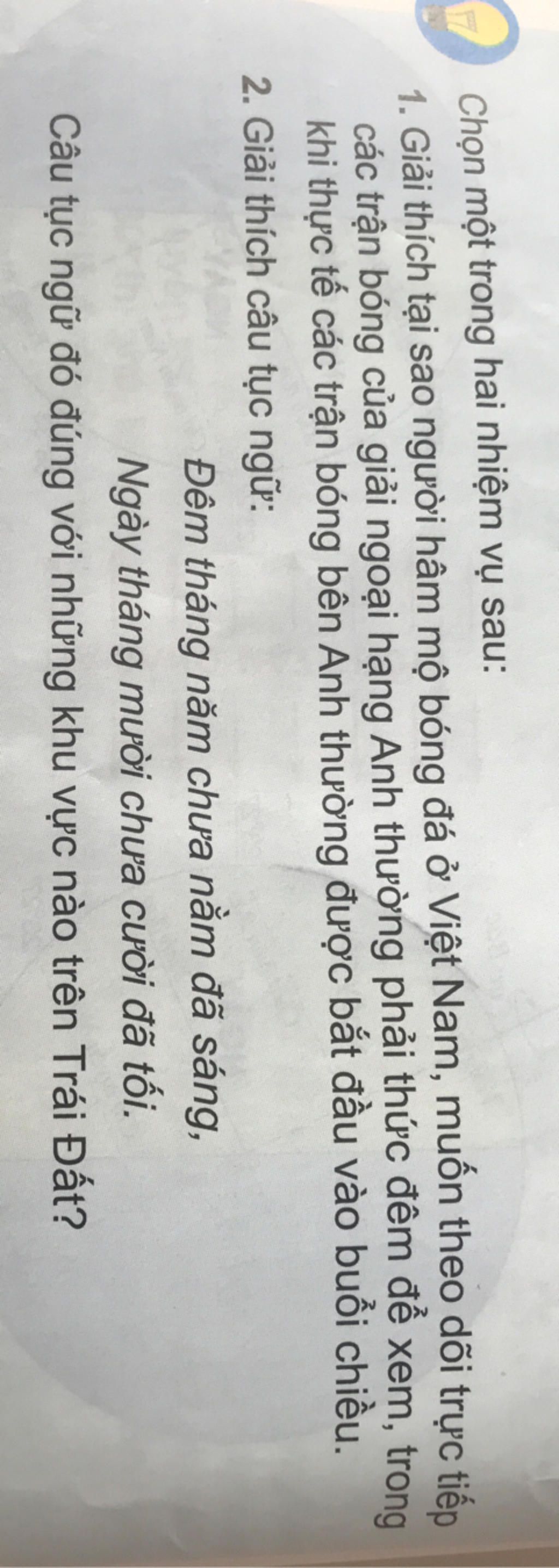 Câu `\bb 1:` Người hâm mộ bóng đá ở Việt Nam, muốn theo dõi trực tiếp các trận bóng của giải ngoại hạng Anh thường phải thức đêm để xem, trong khi thực tế các trận bóng bên Anh thường được bắt đầu vào buổi chiều là vì`:`