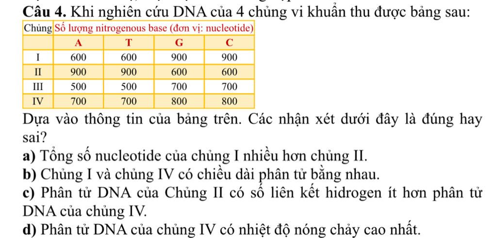 Phân tử DNA của chủng `I` có nhiệt độ nóng chảy cao nhất vì có nhiều `G-C` nhất.
