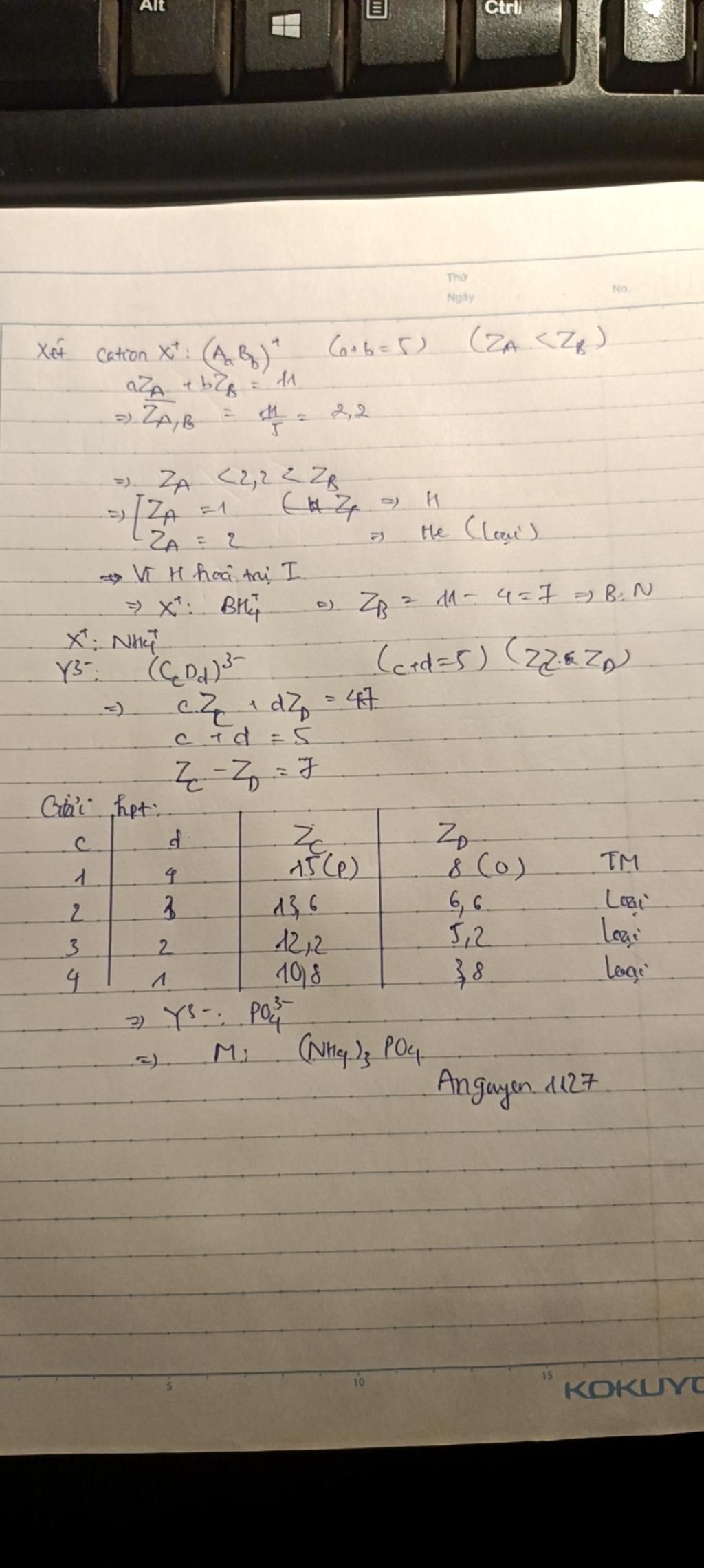 Hợp chất M tạo thành từ cation X+ và anion Y3–. mỗi ion đều do 5 nguyên tử của 2 nguyên tố phi kim tạo nên.Biết tổng số proton trong X+ là 11 và trong Y3– là 47. Hai nguyên tố trong Y3– thuộc 2 chu kì liên tiếp có số thứ tự cách nhau 7 đơn vị. Hãy xác định công thức hóa học của M.