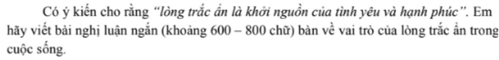 Có ý kiến cho rằng “lòng trắc ẩn là khởi nguồn của tình yêu và hạnh phúc”. Em hãy viết bài nghị luận ngắn (khoảng 600 – 800 chữ) bàn về vai trò của lòng trắc ẩn trong cuộc sống.