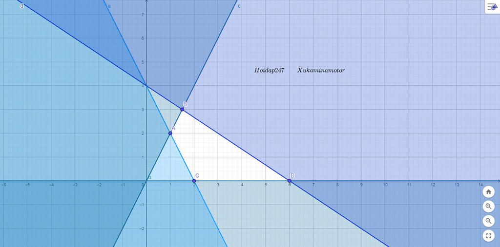 Vậy miền nghiệm của hệ bất phương trình là miền tứ giác `ABCD` ( miền không bị gạch )