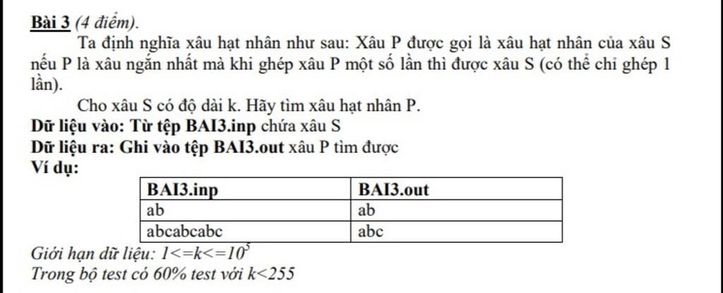 Cho xâu S có độ dài k. Hãy tìm xâu hạt nhân P.