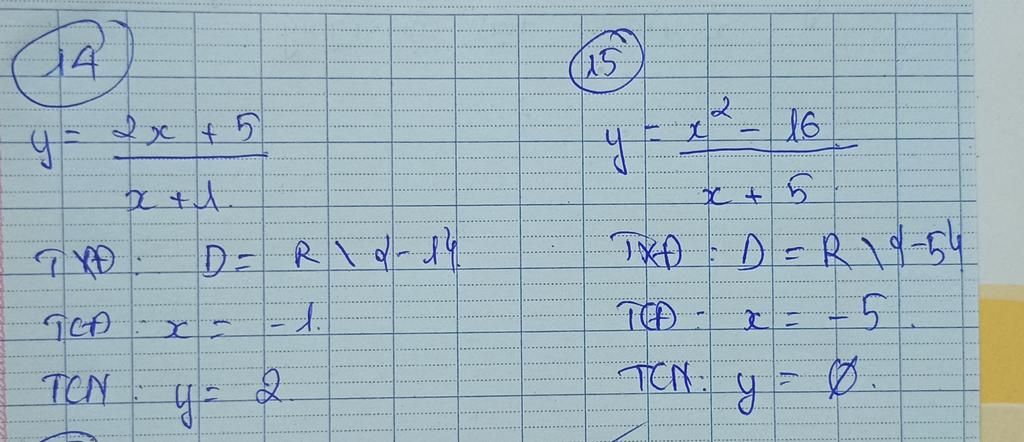 `14.` Phương trình đường tiệm cận đứng, đường tiệm cận ngang của đồ thị hàm số `y =` $\frac{2x+5}{x+1}$ là?