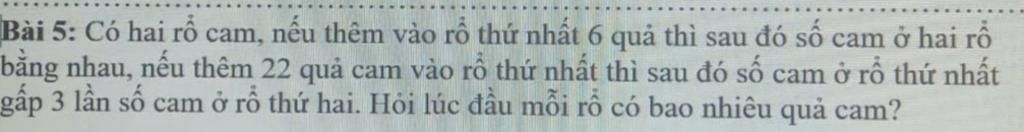 Hiệu số quả cam giữa hai rổ khi thêm `22` quả cam vào rổ thứ nhất là`:`