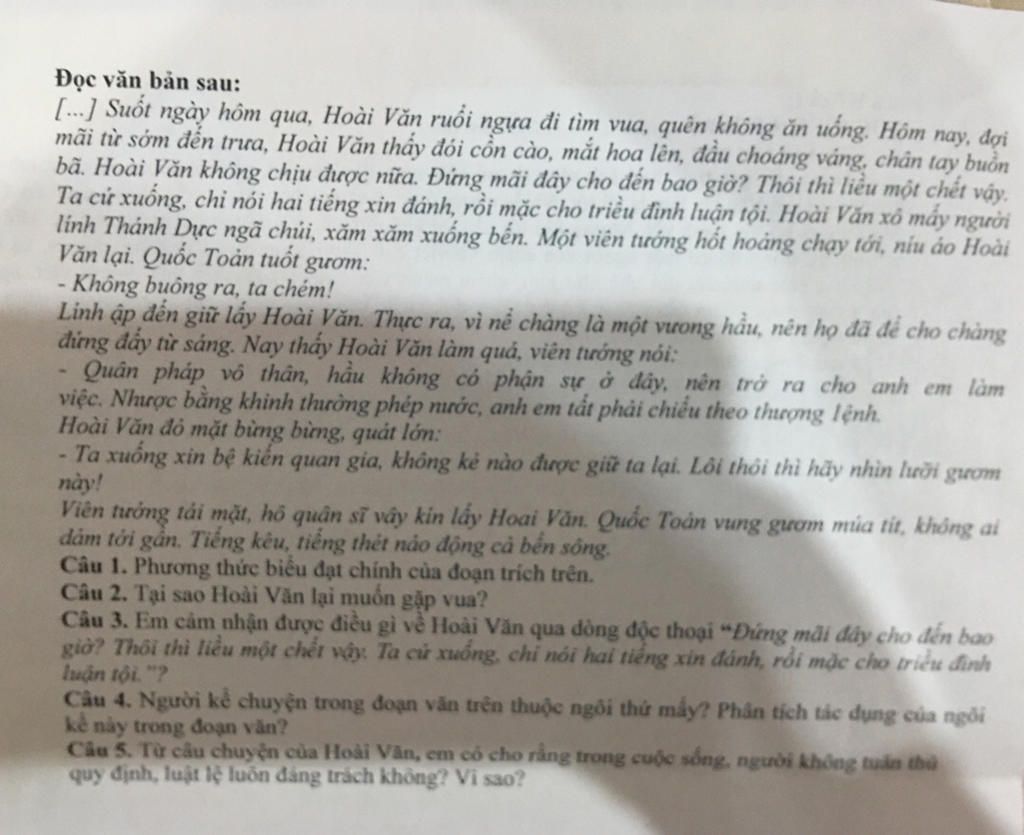 5. Trong cuộc sống, đúng là không tuân thủ quy luật là đáng trách. Nhưng còn phải xem quy luật đó như thế nào: Nếu quy luật là điều phải, điều đúng thì không tuân theo là sai, là tự làm ảnh hưởng tới bản thân tới cả xã hội. Nhưng quy luật mà đưa ra sai, không hợp lí thì ta cũng nên đưa ra nhận định, suy nghĩ đúng đắn của bản thân để bãi bỏ nó... Nhưng ở trong văn bản thì Hoài Văn nửa đúng nửa sai, sai là vì làm trái lệ nước, trái phép của vua - chưa "đủ" tuổi để bàn việc nước nhưng lại có những hành vi ở "thời đó" coi là phản quốc, phản lệ vua - đó là cái sai, sai này cũng ảnh hưởng tới chính bản thân của Hoài Văn, thử hỏi nếu vua không nghĩ theo hướng như thế mà cũng lại cứ nhất nhất áp theo luật nước thì Hoài Văn sẽ mất đầu, ảnh hưởng cả tới những người xung quanh của mình - tru di tam tộc (diệt cả họ). Nhưng vua cũng hiểu được cái "đúng" của Hoài Văn, ta - người đọc cũng hiểu được, đó là nói lên lòng, nói lên quan điểm bất đồng với những gì không hoàn toàn đúng - "cho giặc mượn đường" - chả khác nào như bán nước? Chính thế, nên chúng ta khi quyết định làm bất cứ thứ gì, nên suy nghĩ xem cái thứ ta định phản bác lại có sai hoàn toàn không, đúng thời điểm để nêu ra quan điểm hay không, biết là Hoài Văn yêu nước - nhưng yêu nước như vậy nếu vua không phải người biết nghĩ xa thì sẽ vô cùng nguy hiểm.
