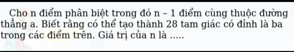 Cứ 1 cặp điểm trong `n-1` điểm trên đường thẳng thì tạo với điểm nằm ngoài đường thẳng thì tạo thành 1 tam giác.
