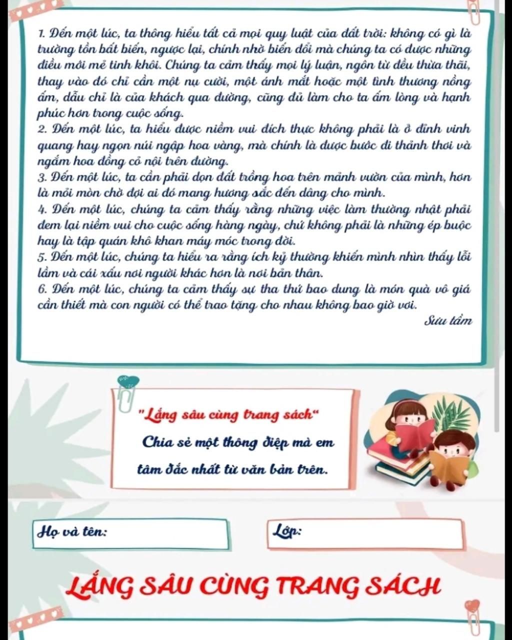Thông điệp mà em tâm đắc nhất trong văn bản trên: ''Đến một lúc, ta cần phải dọn đất trồng hoa trên mảnh vườn của mình, hơn là mỏi mòn chờ đợi ai đó mang hương sắc đến dâng cho mình'' Thay vì thụ động chờ đợi những điều tốt đẹp đến, chúng ta nên chủ động tạo ra những giá trị đó. Giống như một người làm vườn, chúng ta cần phải chăm sóc, vun trồng để vườn hoa của mình luôn tươi tốt. Áp dụng vào cuộc sống, câu nói này nahwcs nhở em rằng hạnh phúc không phải là điều tự nhiên mà có mà là kết quả của những nỗ lực không ngừng nghỉ. Em nhận ra rằng tương lai của mình nằm trong tay em và em hoàn toàn có thể tạo ra một cuộc sống ý nghĩa. Cuộc sống của chúng ta cũng giống như một mảnh đất trống: niếu chúng ta không chủ động gieo hạt làm sao có thể có hoa thơm trái ngọt? Qua điều đó, em sẽ cố gắng học tập, không ỷ lại và nhờ vào người khác, vì tương lai của em chỉ có thể nằm trong tay em!