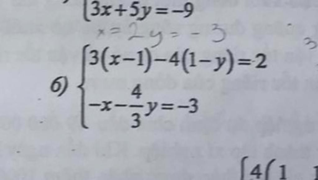 `6) {(3(x-1)-4(1-y)=2),(-x- 4/3 y=-3):}`