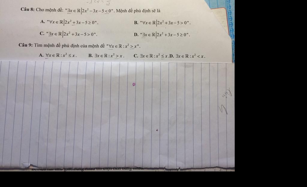 Câu `8` : Mệnh đề phủ định của mệnh đề '' `exists x in RR | 2x^2 - 3x - 5 < 0` '' là