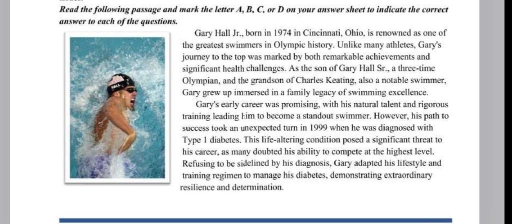 - B. Sai. "Refusing to be sidelined by his diagnosis, Gary adapted his lifestyle and training regimen to manage his diabetes, demonstrating extraordinary resilience and determination." -> ông ấy vẫn tiếp tục thi đấu thay vì nghỉ hưu sớm