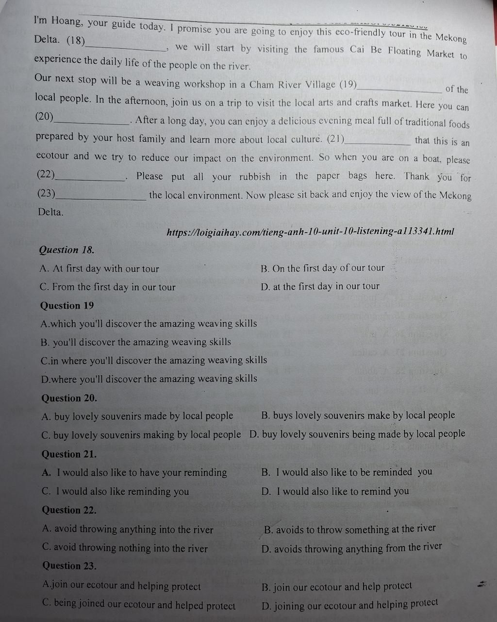 22.A( avoid +V-ing;+ Dịch: Vui lòng không vứt bất cứ thứ gì xuống sông, throw into:vứt)