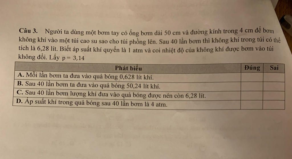 D. Áp suất khí trong quả bóng sau `40` lần bơm là `p (atm)`