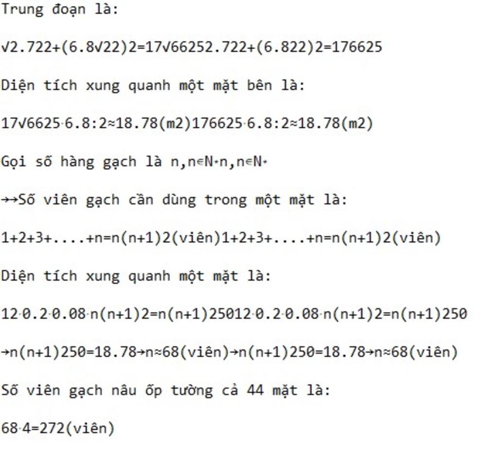 Một ngôi nhà hình kim tự tháp (có gạch nâu ốp bên ngoài) được bao quanh bởi rất nhiều cây cối và là nơi tuyệt vời để nghỉ mát mùa hè; ngôi nhà có chiều dài, chiều rộng là 6,8m, chiều cao là 2,72m. Khi xây dựng ngôi nhà, người chủ đã tính toán số viên gạch nâu hình hộp chữ nhật cần ốp tường; biết hàng trên ít hơn hàng dưới 1 viên, hàng trên cùng là 1 viên, kích thước viên gạch nâu hình hộp chữ nhật là 0,2m - 0,08m - 1m. Hãy dự tính số viên gạch nâu ốp tường cả bốn mặt của ngôi nhà.